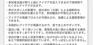 集団マインドマッピングに近い方法ですが業務で数回試行してみたことがあり、そのときの感想としてもなかなか効果的な手法になりそうな手応えがありました。